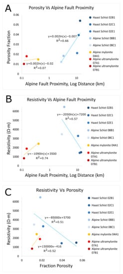 The electrical resistivities of the Haast and Alpine Schists have different relationships with porosity compared to Alpine mylonite and ultramylonite. Schist samples exhibit a decrease in porosity and an increase in electrical resistivity approaching the Alpine Fault (Figure 6), which suggests their electrical properties are dominated by charge transport in pore fluids, as expected for saturated porous media [11]. With increasing deformation and metamorphism, these schists would have experienced pore closure by solution-transfer during grain-size sensitive creep, perhaps with a contribution from intracrystalline deformation during progressive schistose fabric development [65,66,67,68]. This explains the decrease in porosity observed in higher metamorphic grade Alpine Schist samples with stronger tectonite fabrics sampled closer to the Alpine Fault (Figure 6, Table 1).