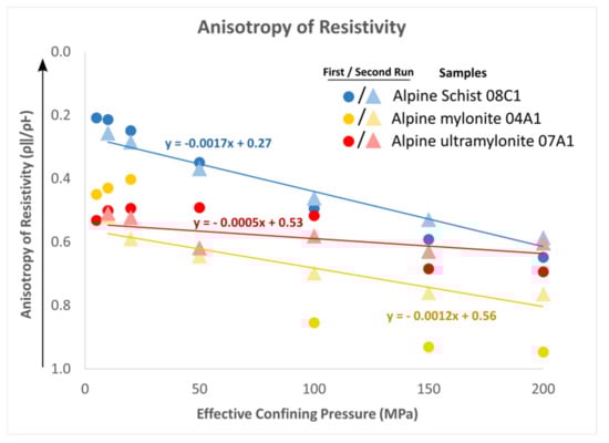 As noted previously, any observed increase in resistivity with increasing effective confining pressure (Figure 5) is likely related to a diminishing ability of pore fluids to transport charge due to reduced porosity. We can most logically attribute the change in anisotropy with increasing effective confining pressure, which is greatest in schist samples where pore fluid conductivity dominates, to the closure of permeable high aspect-ratio cracks and pores. Fractures and high aspect-ratio pores usually occur parallel to foliation in the weaker phyllosilicate bands, providing a preferred permeability in that orientation in anisotropic or layered rocks such as schist [25,59,60]. This generates resistivity that is lowest parallel to foliation (Figure 7). With increasing effective confining pressure, the anisotropy of permeability is reduced as cracks and high aspect ratio pores close. This results in a decrease in loss of anisotropy in both resistivity and permeability [59,60].