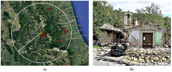 After the 2016 Central Italy earthquakes, the authors, as ReLUIS members, participated in the activities surveying monumental buildings, which were coordinated by the Italian Civil Protection Department and the Ministry of Cultural Heritage. In this framework, a total of 36 churches were inspected starting from September 17: 11 were in the municipalities of Accumoli and Amatrice (near the epicenter of 24 August); 20 were near the city of Teramo (approximately 40 km away from the 24 August epicenter); the 5 farthest away are located near Macerata, in the northern surveyed area, or in the proximity of L’Aquila city (at about 80 km from the epicenter of 30 October). The geographical localization of the inspected churches is represented in Figure 1a, while in Figure 1b, as an example, an image of a collapsed church observed during the inspection in the Amatrice municipality is shown.