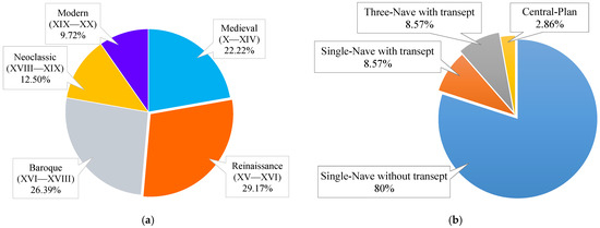 The investigated churches were founded in five distinct temporal–architectonic intervals (Figure 3a). In detail, 22.22% of the sample is composed of medieval churches, characterized by poor decoration, in accordance with the main peculiarity of Central Italian medieval churches [77,78]. A proportion of 29.17% of the inspected churches were founded between the XV and the XVI centuries (the Renaissance period), including the meaningful example of the Dome in Campli (Figure 2a). The religious buildings belonging to the Baroque period (from the XVI to the XVII century) are characterized by impressive facades, with interiors animated by aisles, vaults, and often rich frescoes—such churches constitute 26.39% of the sample. The architecture of the Neoclassical cluster (12.50% of the sample) is inspired by Classical Era principles; therefore, the spatial characterization is marked by stuccoes, producing a well-balanced dynamism that never exhibits contrasting tensions. The last set (9.72% of the sample) was built in the Modern Age, i.e., in the XX century, and it is composed of churches of smaller dimensions and often characterized by less refined masonry (irregular texture characterized by stone elements).