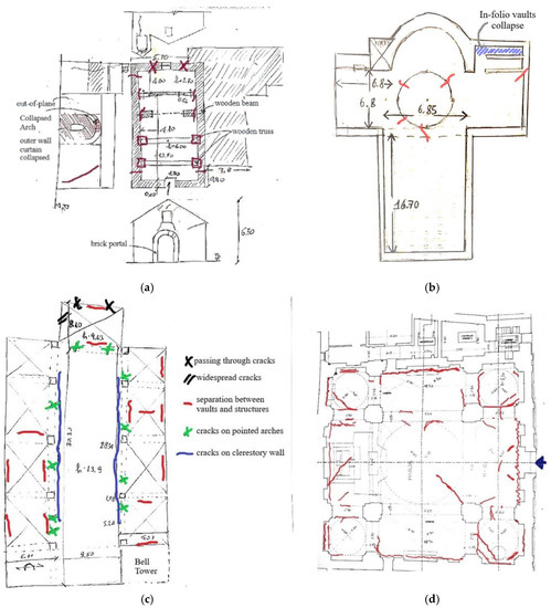 Plan configuration with observed crack patterns of some inspected churches: sketches made during the inspections. (a) Single nave (SN) typology: the church of Saint Elpidio in Campli. (b) One nave with transept (SNT): St. Lowrance in Civitella del Tronto. (c) Three naves and transept (3NT): the Dome of Campli, Holy Mary in Platea. (d) Central plan configuration (C): the church of Saint Savino in Gualdo.
