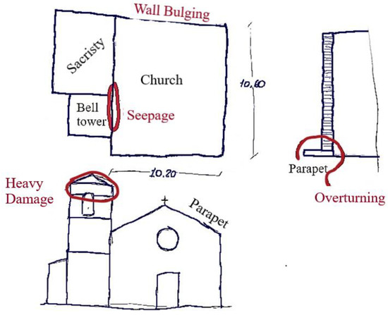 To summarize, the single nave without transept (SN) category comprises the larger sample, i.e., 80% of the inspected churches. Among them, 27.59% were built in the Medieval era, 24.14% in the Renaissance, and 20.69% in the Neoclassical period. The churches characterized by a single nave and built in the Baroque or Modern period comprise 13.79% of the clusters in both cases. All the churches characterized by the single nave without transept are moreover characterized by the following features: (i) a façade with a rose window over the entrance and a triangular or rectangular gable; (ii) a double pitched timber roof; (iii) a belltower beside the church. These typical features depict the “Apennine church” typology, as defined in [44,67,70,74] after the Central Italy earthquake. An example of a surveyed “Apennine church” is the St. Maxim Oratory in Collalto (Amatrice), sketched in Figure 5.