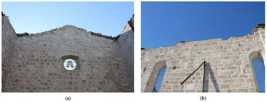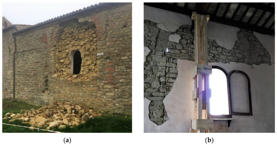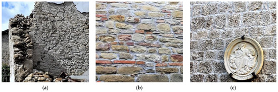 The inspected churches are characterized by different masonry typologies, depending on their geographic location and the importance attributed to the church by the community (Figure 6). The typical masonry walls often consist of local irregular stones, frequently characterized by a double layer and a poor-quality mortar (Figure 6a), as also observed by other authors analyzing the churches stricken by the Central Italy earthquake [74]. In the case of medium-importance structures, i.e., St. Savino in Gualdo, the prevailing availability of irregular calcareous stones result in a medium-quality wall (Figure 6b); however, in the case of seismic action, it could easily crumble. Among the surveyed churches, the cases of good-quality masonry are rare and observed only in important monuments, i.e., the Abbey of Holy Mary in Montesanto, in which calcareous bricks, regular in size and shape, can be observed (Figure 6c).