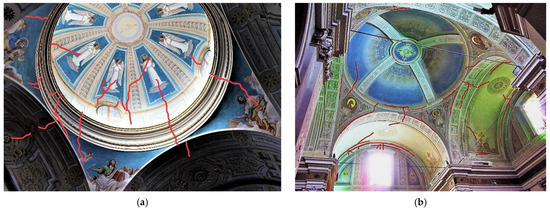 Surveyed domes: (a) St. Lowrance in Civitella del Tronto; (b) St. Savino in Gualdo, Macerata. The observed crack pattern has been highlighted in red.