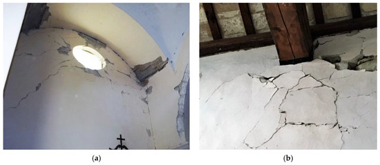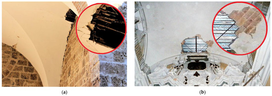 Several churches present domes (Figure 7) and vaults (Figure 8), among these, the false camorcanna vaults (Figure 8a) and the more vulnerable in folio vaults (Figure 8b) were observed. In the case of inspectable roofing, a non-pushing timber light roof was typically detected (47% of the sample); only in one church—the Virgin of Rescue in Campli—was the gable roof made of one-way ribbed slab.