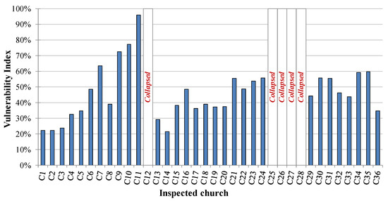 For all the analyzed churches, the obtained vulnerability indexes are listed in Table 2 and reported in Figure 9. It is worth underlining that the vulnerability index cannot be evaluated for the collapsed churches (C12, C26–C29), since the inspections were realized only after the earthquake when the collapses had occurred. The results of the LV1 procedure (Table 2, Figure 9) show a predominant low–medium vulnerability of the inspected churches: 39% of the sample is characterized by a low vulnerability index (lower or equal to 0.40), 36% had medium vulnerability (the vulnerability index ranges between 0.40 and 0.60), and 25% were marked by high vulnerability.