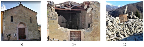 The St. Lawrence and St. Paul Church in Accumoli: (a) before the Central Italy earthquake; (b) after the 24 August strong motion; and (c) after the earthquake occurred on 30 October 2016.
