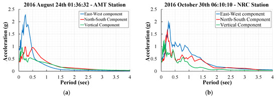 Acceleration response spectra for the 24 August (a) and 30 October (b) main shocks [80].