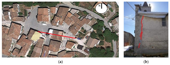St. George church in Terracino (Accumoli): (a) aerial photography (adapted from Google Maps) with east–west axis orientation (red line); (b) façade overturning mechanism (cracks emphasized in red).