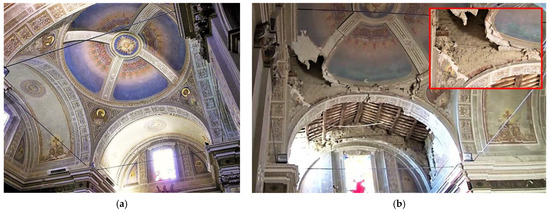 The dome in St. Savino church in Gualdo, before (a) and after (b) the earthquake occurred on 30 October 2016.