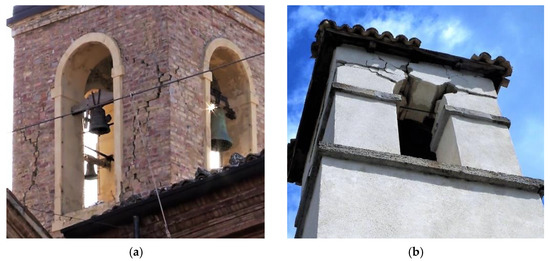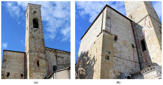 The belltowers frequently present damages in the pinnacles, in the bell cell, and along the tower. In particular, the damage on the stem can be detected when the variation of the vertical stiffness in the structure is significant, i.e., for towers connected to the church (Figure 18). Instead, the most damaged element becomes the cell when the variation in stiffness is more gradual. In fact, in all inspected cases these elements are characterized by the presence of large openings and by vertical bearing elements with reduced thickness, since the working loads that they should sustain are low. Consequently, the cells can experience a shear failure, as in the case of the St. Savino church in Gualdo (C36), where a significant crack pattern on the piers was detected (Figure 19a). Finally, when the piers are strong enough, the damages are localized on the upper part of the cell (Figure 19b).