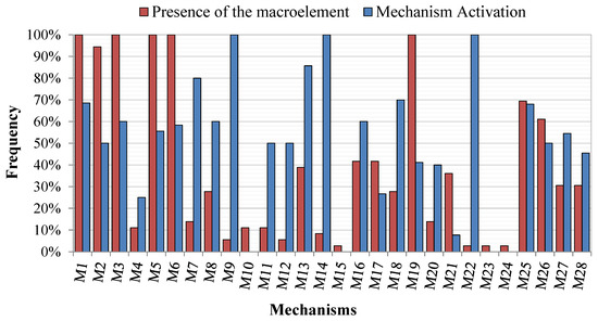 Figure 21 shows the relative presence and occurrence of the mechanism activation for each macroelement—recalled following the nomenclature used in Table 1. Observing the red bars, in more than 90% of the surveyed churches the façade, (M1, M3), the gable (M2), the nave (M5–M6), and its roof (M19) were present, as expected. In more than 60% of the cases, plano-altimetric irregularities (M25) and the standing-out elements (M26) were observed. The vaults were present in different positions inside the church, such as in the nave, the transept, etc., for about 42% of the cases; however, if consideration is limited to the more relevant elements, characterized by weight ρk = 1 (i.e., M8 and M9 according to Table 1), this proportion reduces to 31% of the cases. The other macroelements—the belltower (25%), transept (11%), dome (8%), and chapel (3%)—were registered with significantly lower frequency.