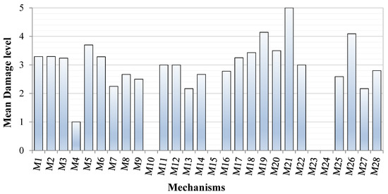 In order to evaluate whether the church sample was composed of homogenous data in terms of structural features and seismic responses, the surveyed churches’ vulnerability was assessed according to the simplified LV1 procedure proposed by the Italian guidelines on the assessment and the mitigation of the seismic risk on the cultural heritage [76]. The methodology analyses the constructive details and features according to the procedure proposed in [36], through the direct observation of the existing macroelements, including 28 mechanisms (M), as shown in Table 1. The principal advantage of the approach is the limited amount of data necessary, which is essential for a quick assessment. The LV1 methodology allows having a first seismic vulnerability classification of the church based on the assessment of a vulnerability index that ranges from 0 (if the church does not present seismic vulnerability) to 1 (if the church has a high vulnerability). The vulnerability index, iv, is defined as a weighted sum of the vulnerability indicator assigned to all possible local mechanisms that could occur in the structure, regardless of the probability of their contemporary activation. According to [76], the vulnerability index can be estimated as follows: