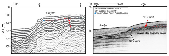 On the seismic profiles acquired along the perimeter of the Adventure Plateau, we have identified a high-amplitude and continuous reflector associated to the combination of: (i) a subaerial erosion (subaerial unconformity, SU) that marks the landscape exposed at the moment of the maximum marine regression (i.e., the minimum of the sea level corresponding to the MIS 2) and (ii) the subsequent transgressive reworking surface (wave ravinement surface, WRS) that develops progressively landward during shoreface retreat due to wave action [31,32,33]. The SU+WRS surfaces are generally recognizable on seismic profiles by their planar geometry over large horizontal distances, the erosive truncation of the underlying strata and the superposition of sedimentary beds often characterized by a sub-horizontal or gently dipping stratal geometry. The pattern of the SU+WRS surfaces can vary from flat to very irregular due to several factors, the most important being the inherited topography of the substrate and lateral variations of waves energy and the differential resistance to erosion of the bedrock [33]. Figure 2 shows two representative high-resolution profiles where the LGM unconformity, produced by subaerial erosion (SU) and subsequent wave action (WRS) during the sea level rise, and the truncated prograding wedge, associated with the rapid sea level fall, can be recognized. Along these seismic profiles, it is possible to locate the position of the LGM palaeo-shoreline. In particular, the geographic location of the ancient coastline at the LGM has been mapped at the subaqueous clinoform rollover point at the seaward termination of the SU+WRS unconformity [31]. In some seismic profiles, these specific features are difficult to identify since the original shoreline was likely reworked/eroded by the wave action during the landward migration of the shoreface. In areas characterized by very low gradients, where the rollover points are often not recognizable, we have combined seismic data with high-resolution bathymetric information, when available, to identify and map the slope breaks.
