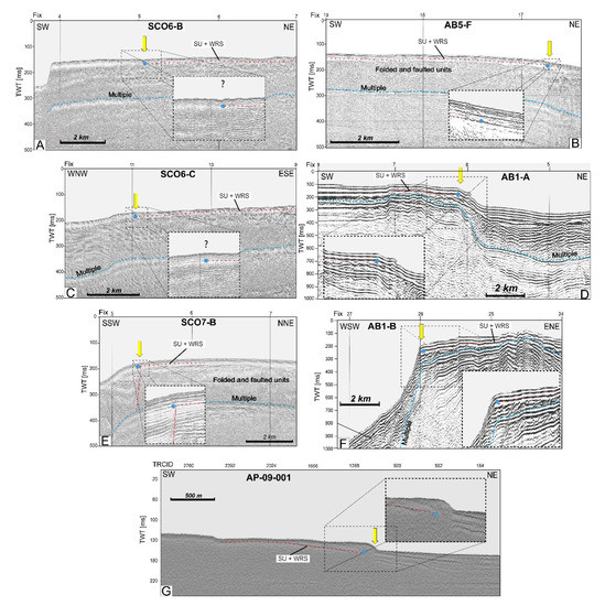 In several cases, highly deformed and inclined horizons cut by erosional unconformities and covered by sub-parallel layers are seen on seismic data (Figure 3B,D–F). The location of the rollover points of the prograding wedges, which identify the palaeo-coastline along all the seismic profiles, is indicated with a yellow thick arrow in Figure 3.