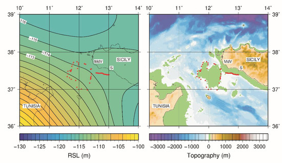 Red dots in Figure 4 mark locations of the palaeo-coastline derived from the geophysical interpretation discussed above. Along the coastal area between Mazara del Vallo and Sciacca, locations of the palaeo-coastline have been taken from [24]. We note that model ICE-7G has been shown by [39] to be generally consistent with the relative sea level records from various locations across the Mediterranean Sea, which motivates our choice of the model for this palaeo-geographic reconstruction.