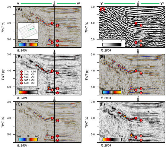 | Sweetness | Computed by dividing the envelope by the square root of instantaneous frequency. | ![]() | First discovered by Radovich and Oliveros [35], sweetness is a relative value helpful for determining relative net-to-gross ratios and to identify “sweet spots” in hydrocarbon exploration. | [35,36,37] |