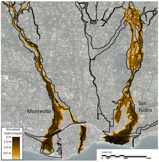 The Santa Barbara model was compared to inundation boundary polygons from Kean et al. (2019) [1]. Kean et al. (2019) also measured depths from post-event debris lines. These data are confounded by the uncertainty surrounding the initial ground surface and dynamic ground elevation, and regularly generated 2 to 5 m, heteroscedastic, residuals in other modeling studies [17,34,35], particularly for observed depths > 1 m. However, these data can identify if model depths were systemically high or low and were used to evaluate depth results.