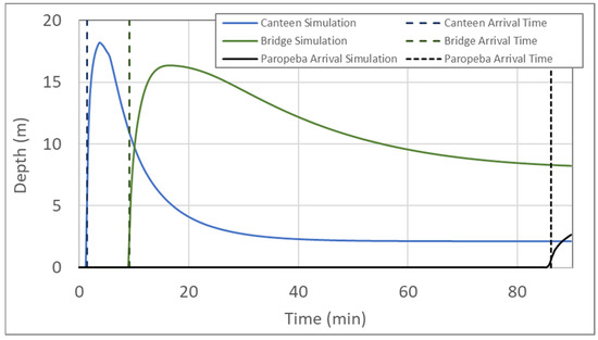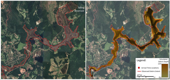 The maximum mud depths computed in the HEC-RAS/DebrisLib, non-Newtonian simulation are compared to inundation boundaries and aerial photographs of the post-failure Brumadinho landscape in Figure 4. The model simulated the measured mudplain with Lumbroso et al.’s (2021) [20] rheological parameters, returning a true positive rate of 0.93, threat score of 0.82 and ΩTm of 0.18. The model also reproduced the arrival time within 2% of the observed result (Figure 5 and Table 4). The HEC-RAS results were also similar to Lumbroso et al.’s (2021) [20] Mike 21 model. The Supplementary Materials, Figures S1–S3, include side-by-side mudplain simulations at the three control points (Canteen at 1 m 30 s and Railway Bridge at 9 m 10 s).