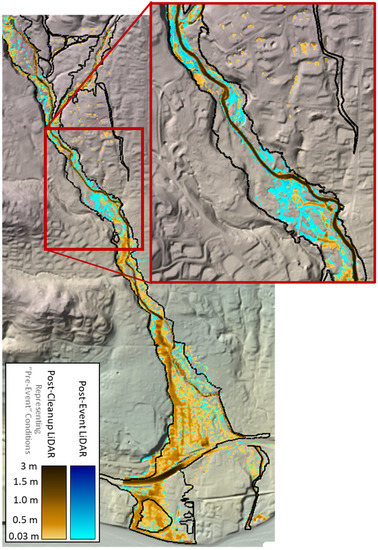 The current model is also limited by the fixed-bed assumption. The bed changes dramatically during the event, so a fixed-bed bathymetry will not reflect the substantial impacts of deposition and erosion on peak inundation. The Santa Barbara models used post-cleanup (October 2018) DEMs to approximate the pre-event information a modeler or emergency manager would have before an event. However, the models performed better with a DTM collected immediately after the event (January 2018) that included some of the event deposition (Figure 6), particularly in the upstream reaches of Montecito. Developmental versions of HEC-RAS included coupled non-Newtonian and mobile-bed sediment transport capabilities, which will be available in future releases.
