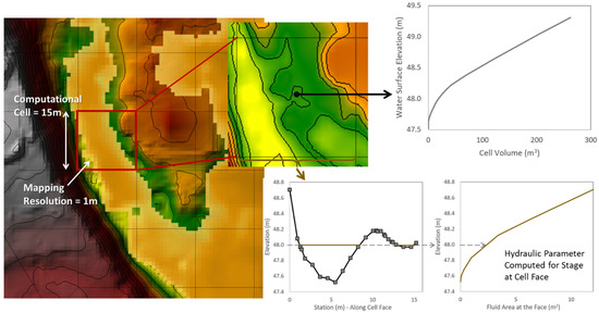 Illustration of the sub-grid approach in HEC-RAS. Intra-cell stage-volume curves and hydraulic parameter curves at each cell face incorporate terrain information at the resolution of the terrain, allowing larger cells and shorter run times. Sub-grid mapping also computes inundation area within each cell.