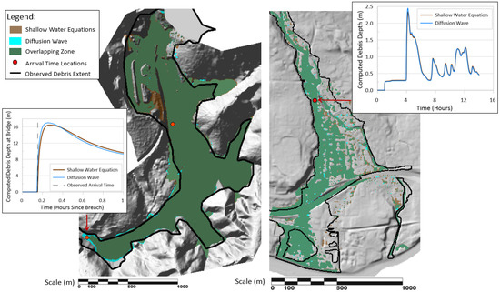 The models’ results presented in all previous figures used the full Shallow Water Equation (SWE) solver in HEC-RAS (USACE, 2021). However, DebrisLib and the non-Newtonian capabilities are also connected to the HEC-RAS Diffusion Wave (DW) [28] solver. Diffusion wave hydraulics ignore the acceleration term in the SWEs, making them less accurate, but faster and more stable. The study team ran each of these models with the DW equations, and representative comparisons are mapped in Figure 11. DW required about half the run time as the SWE models.