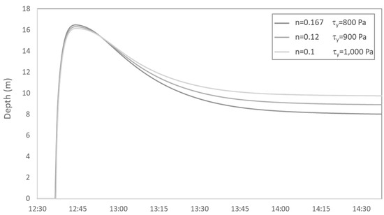 For example, Figure 12 includes the depth time series from the railway bridge observation point (From Figure 5) in the Brumadinho model. This figure includes results from the calibrated run and two simulations with lower n values and higher yield strengths that compensate for the losses to generate similar arrival times and maximum depth.