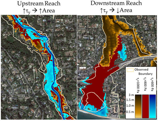Illustration of the yield strength–area tradeoff. Higher yield strengths inundated more of the upstream reaches but less of the downstream area, while lower yield strengths spread out to inundate more of the flatter, downstream, area but did not inundate as much of the higher gradient, upstream, reach.