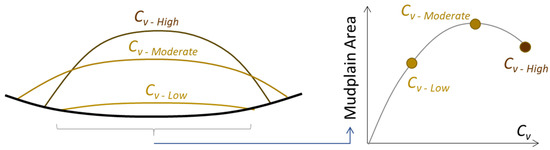 Schematic illustration of potential non-monotonic parametric effects of rheological parameters. When the model uses concentration-dependent rheological parameters the relationship between concentration and inundation area can be non-monotonic, as concentration increases “mounding” and limits lateral runout, which can compensate for volume increases (vertical scale in the schematic exaggerated to illustrate effect).