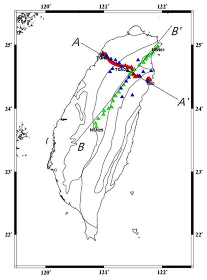 The positions of two orthogonal linear dense arrays deployed in north Taiwan in east–west (A-A′ line) and south–north (B-B′ line) directions. The blue triangles represent 19 broadband seismic stations installed from May 2007 to July 2008. The green triangles indicate 25 broadband stations installed from February 2008 to June 2009, and the red triangles are 45 short-period stations installed from March 2008 to June 2008.