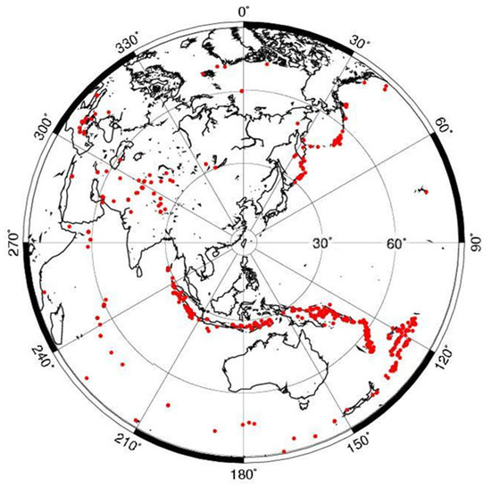 The red dots are the positions of the epicenters of the teleseismic earthquakes used in this study, in which the magnitudes are larger than 5.0 Mw and the epicenter distances are between 30° and 90°.