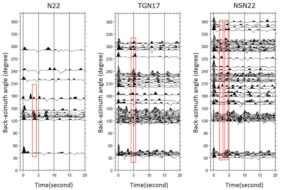 Back-azimuth receiver function plots of stations N22, TGN17 and NSN22.