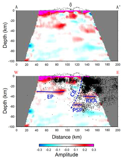The CCP stack of receiver functions along the A-A′ profile. The topography along the A-A′ profile is shown at the top of the figure. The triangles represent the locations of seismic stations which are projected to the A-A′ profile and the arrow indicates the cross point of profiles A-A′ and B-B′. The top figure is the CCP stack of receiver functions along the profile. The bottom figure is the interpretation of the top figure and incorporated with the earthquakes relocated by Wu et al. [29] for magnitude (ML) ≥ 3.0 in the past 15 years. The blue dashed line represents the collision boundary “CB” between the Philippine Sea Plate and the Eurasian Plate. The blue lines indicate the Moho discontinuities of the Eurasian Plate (EP), Philippine Sea Plate (PSP) and Ryukyu arc (RKA).