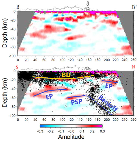 The CCP stack of receiver functions along the B-B′ profile (south–north direction). The top figure is the CCP stack of receiver functions along the profile. The bottom figure is the interpretation of the top figure and incorporated with the earthquakes relocated by Wu et al. [29] for magnitude (ML) ≥ 3.0 in the past 15 years. The blue dashed line represents the Benioff seismic zone. The yellow line is the brittle–ductile transition zone in the upper crust. The blue lines indicate the Moho discontinuities of the Eurasian Plate (EP) and Philippine Sea Plate (PSP).