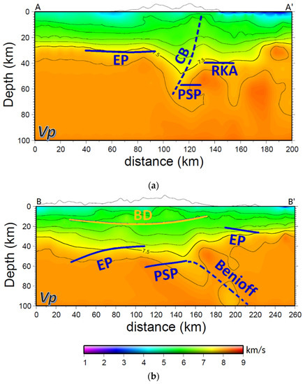 The tomographic P-wave velocity model around the Taiwan region built by Kuo-Chen et al. [13] is used for a comparison with our results. Their P-wave velocity model along the A-A′ and B-B′ profiles are shown in Figure 7a,b, respectively. Using the 7.5 km/s contour as the bottom of the crust [13], and the interval of the contour lines being 0.5 km/s, “two parallel roots” beneath Taiwan were found in their study, which can be seen in the east–west direction velocity profile (Figure 7a). The main root is under the Central Mountain Range and its depth is 50 km, corresponding with the “PSP” for horizontal distances of 110–130 km in Figure 5. The other root is under the Coastal Range and its depth is 40 km, corresponding with the “RKA” for horizontal distances of 130–160 km in Figure 5. In the west side of Figure 7a, the crust depth is nearly horizontal at depths of 28–30 km, correspondent with the “EP” for horizontal distances of 30–90 km in Figure 5. To compare the B-B′ profile (Figure 6) with south–north direction velocity profile (Figure 7b) from south to north; the depth of the crust is about 40 km for the horizontal distances of 40–110 km, the deepest part of the crust is about 45–50 km for the horizontal distances of 120–160 km and shallowest part of the crust is about 25–30 km for the horizontal distances of 190–240 km in Figure 7b, which are correlated with south “EP”, “PSP” and north “EP” in Figure 6, respectively. Although there are little differences in depth between our interpretations and Kuo-Chen et al.‘s Moho depths, the overall trends are consistent. The CCP stack image clearly indicates the positions of the interfaces. In addition, Figure 7 also indicates that the geological structures are very complex in northern Taiwan, which are induced by the collision of the Eurasian Plate and the Philippine Sea Plate. The complexity of geological structures captured by seismic waves can be quantitatively assessed by the seismic propagators [35], so the optimum solution can be estimated by a compromise between geological complexity, seismic imaging accuracy, and computational efficiency.