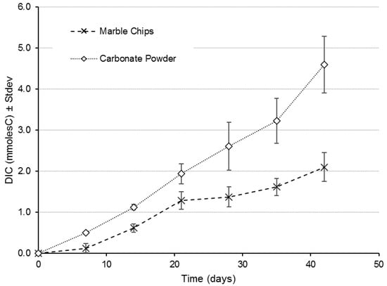 To determine the extent of the release of dissolved organic carbonate (DIC) at pH 10.0, 5 g of a carbonate source (calcium carbonate powder or marble chips with a granule size of 20–30 mm, both Fisher Scientific, Hampton, NH, USA) was added to basal medium (BM, Tables S1 and S2 and described in []). Liquid samples of BM were then taken every 7 days DIC, determined using a Shimadzu TOC5000A employing nitrogen as a carrier gas at a flow rate of 150 mL/min with sodium carbonate/sodium hydrogen carbonate standard solutions for calibration.