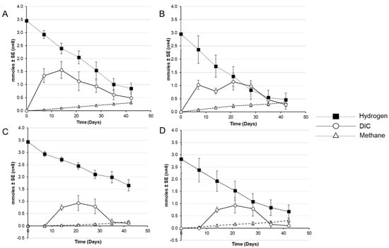 Consumption of hydrogen and generation of dissolved inorganic carbon/methane from calcium carbonate incubated with hydrogenotrophic enrichments from lime (A) and steel (B) sediments, or marble chips incubated with hydrogenotrophic enrichments from lime (C) and steel (D) sediments.