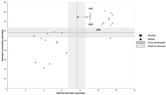 Overall, the microcosms utilising the lime enrichment of methanogens and supplemented with marble chips demonstrated both the lowest hydrogen consumption and methane generation rates (Figure 3). Microcosms that were prepared with methanogen enrichment from the steel site had greater than average methane generation rates, regardless of incubation with calcium carbonate powder or marble chips. With the exception of site SC, the hydrogen consumption rates were also above the average of the sample group. The lime methanogen enrichments that were supplemented with the calcium carbonate powder showed the greatest range of both the hydrogen consumption (37.0–75.1 µmol/d) and methane generation (4.4–10.6 µmol/d) rates. The stoichiometry of the reactors suggested that, although hydrogen was removed from the headspace and DIC from the liquid phase, these substrates were not diverted entirely to methane production (Table S5). This was further evidenced by the analysis of volatile fatty acids within the liquid phase, in which acetic acid was produced in both the lime and steel sediment enrichments supplemented with either calcium carbonate powder or marble chips; however, no VFA were detected in the abiotic controls (Figure S2).