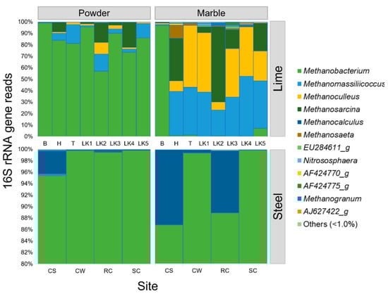 The enrichments from the lime kiln sites that were supplemented with calcium carbonate powder were dominated by taxa of the genus Methanobacterium, ranging from 57.1% in the community from the LK3 enrichment to 99.3% within the B enrichment (Figure 4). Within the lime samples supplemented with marble chips, the B enrichment was also dominated by Methanobacterium sp., representing 96.8% of the community profile, which contrasted with the other lime site sediment enrichments supplemented with marble chips. In the remaining marble chip enrichments, the communities of the T, LK1, LK3, and LK4 enrichments were composed largely of Methanomassiliicoccus (34.6–55.3%) and Methanoculleus sp. (42.1–54.1%). Communities from the H, LK2, LK3, and LK5 enrichments also contained Methanosarcina sp. within their communities (16.5–65.9%). The microcosm communities from the steel site enrichments were again dominated by Methanobacterium sp., whether supplemented with calcium carbonate powder or marble chips representing >86.8% of all the communities.