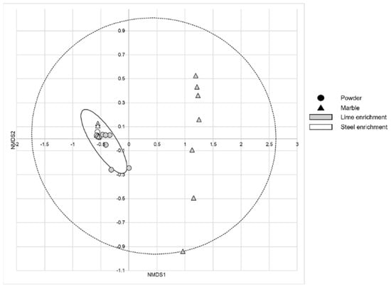 NMDS analysis illustrating the similarities between the steel site sediment enrichments supplemented with either calcium carbonate powder or marble chips and the lime site sediment enrichments supplemented with calcium carbonate powder. There was more dissimilarity between these sediments and the lime site sediment enrichments supplemented with the marble chips. Ellipses include all the sites within the NMDS based upon supplement (inner ellipse = powder) centred on the mean NMDS for those samples.