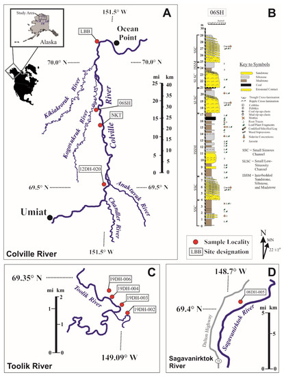 Sample locations and stratigraphic features of sample horizons from the Prince Creek Formation in Alaska. (A) Sample locations in bluffs along the Colville River. (B) Representative stratigraphic column and paleoenvironmental interpretations for the 06SH sample locality along the Colville River. (C) Sample locations in bluffs along the Toolik River. (D) Sample locations in bluffs along the Sagavanirktok River. Figure modified from [31,32].