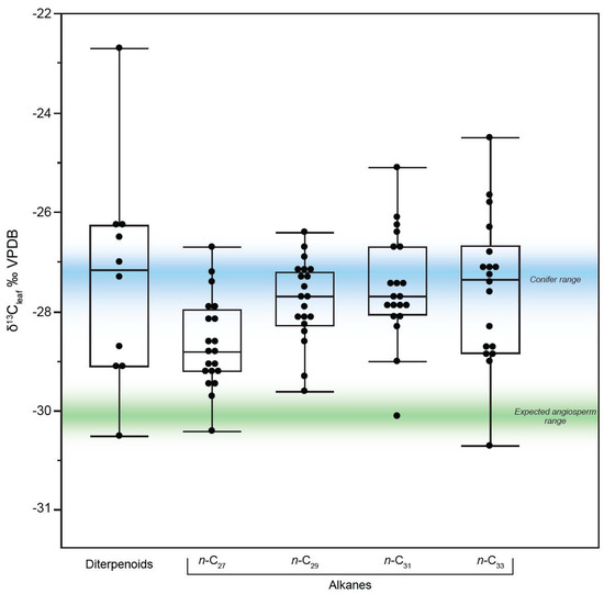 The carbon isotopic compositions of the long-chain n-alkanes were similar for n-C27 to n-C33 (Table S7; Supplementary Data File) with mean values of −28.7, −27.8, −27.5, and −27.6, respectively. To compare these values to the conifer diterpenoids, we converted the n-alkane and diterpenoid δ13C values into leaf δ13C values by accounting for the carbon isotope fractionation between the biomarker and leaf values with ε13Cbiomarker-leaf values [52]. The resulting leaf values derived for n-alkanes (C33 = −27.6‰ VPDB, n = 18) were similar to the conifer derived diterpenoids values (−27.3‰, n = 10). This is consistent with the majority of the n-alkanes being derived from conifers [41].