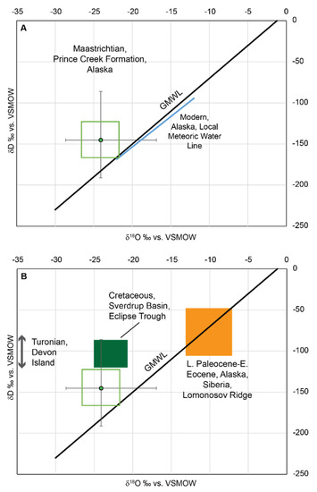 Our compilation of water isotope data from the Prince Creek Formation (average δ18O = −24.3‰ VSMOW; average δD = −145.2‰ VSMOW) plot in a field above the Global Meteoric Water Line (GMWL; Figure 4A) with a δD value about 40 per mil higher than the average δ18O intercept with the GMWL. Similarly, water isotope data from Cenomanian units in the Canadian High Arctic (average δ18O = −22.1‰ VSMOW; average δD = −106.5‰ VSMOW) also plot in a field above the Global Meteoric Water Line (Figure 4B), with a δD value about 60 per mil higher than the average δ18O intercept with the GMWL. We note that this even higher apparent deuterium excess from mid-Cretaceous units is temporally associated with the peak warming of Cretaceous period [64].