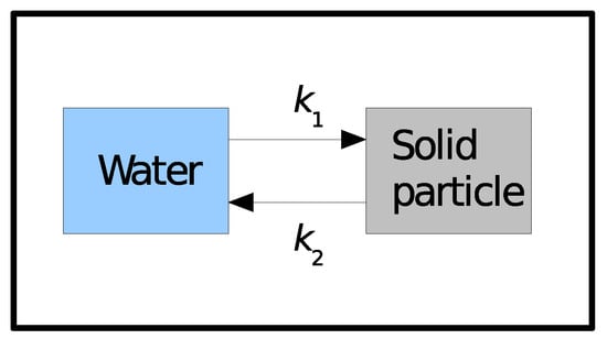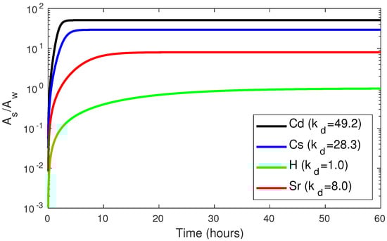 Let us consider a closed system consisting of a volume of water that contains sediments, to which a tracer is added in dissolved form at . If we take the parameters for this case (selected just as an example but of the typical order of magnitude []) as s and s, then from Equation (3), .
