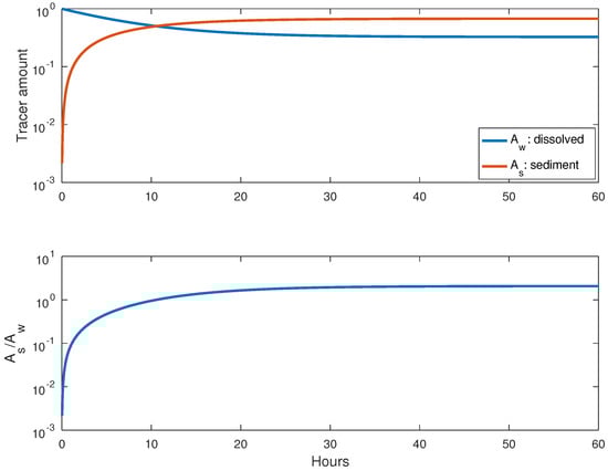 With the indicated above, we obtain and . However, the difference in behavior between the equilibrium and dynamic models is clear: in the model, the sediments instantaneously adsorb all the tracers they are able to; in contrast, adsorption is delayed in the dynamic model. The solution of Equation (2) (dynamic model) for this case is presented in Figure 2. It is certain that the tracer amount in sediment increases in time, and equilibrium is reached after some tens of hours (with the present values of and ). Once equilibrium is reached, the ratio between the amount of tracers in sediment and water is numerically equal to the , as given by Equation (3). This may be seen in the bottom panel of Figure 2. In addition, tracer fractions in water and sediments are equal to those predicted by Equation (4) of the model (top panel).