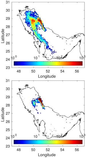 Modeled distributions in seabed sediments (units/kg) of a hypothetical tracer released in the Persian Gulf if simulated with a model (top) and a dynamic model (bottom). The release was considered constant in time and lasting 90 days. Results after these 90 days are presented.