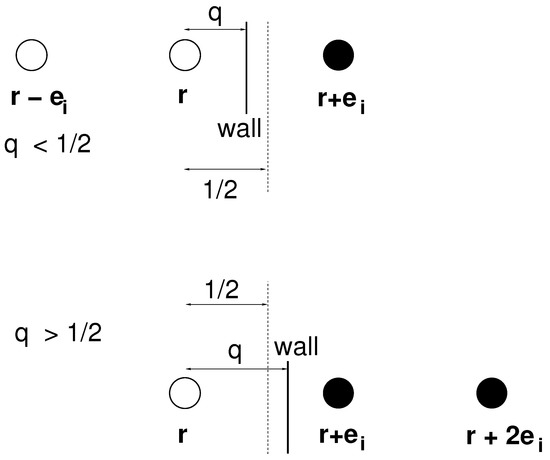 where is at the moment unknown and is the velocity of fluid in the (fluid) node adjacent to the wall (see Figure 1). The concentration at the boundary is specified, which we denote by . Then, since the sum of the s gives the concentration, when substituting Equation (6) into (5) at the boundary one obtains . We can solve this equation for and, consequently, the unknown incoming distribution functions. These two boundary conditions for f and g operate when the boundary is midway between a (full) solid node and an (empty) fluid node.