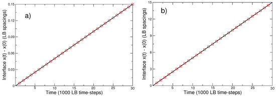 Aaron et al. [28] give the analytic solution for the problem that depends on a parameter k which is given by . The interface at is given by , where is a complicated function of k [28]. We use the LB boundary condition derived above to model this boundary problem. The actual numerical solution is calculated with a D3Q19 model with periodic boundary conditions in the y and z directions. We set the initial (solid–liquid) boundary at and the length of the lattice is . In Figure 2 we compare the LB solution with the analytic solution for two k values. Very good agreement is found in both cases.