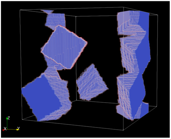While the LB method has (historically) operated on lattice nodes which are either fully fluid (or void) or fully solid, in recent years, there have been attempts to relax this constraint. One promising avenue of investigation is referred to as the partially saturated, or grayscale method [7,12,13,14,15,16]. In the grayscale model, lattice nodes can be partially fluid and are assigned a grayscale value between 0 (void) to 1 (solid). When solving for fluid flow, this results in an additional fluid drag on those lattice nodes with a non-zero grayscale value. The actual amount of drag is a function of that node’s grayscale value. Using this grayscale model, Pereira et al. [17,18,19] were able to determine permeabilities of real rock samples whose physical constitution could not be easily modelled with classical LB methods.