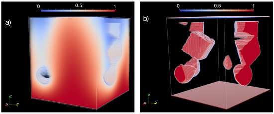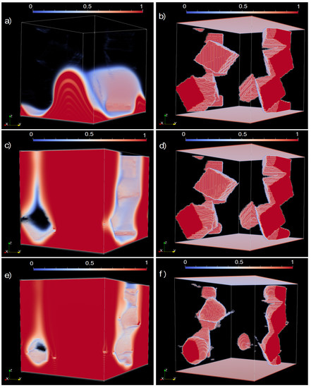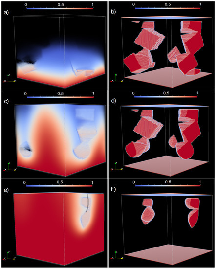 In the second case, we use an LB diffusion relaxation rate of which gives a diffusion constant, D, of 3.33 , while the pressure gradient is the same as before, at . In this case, we estimate that the Peclet number of the flow is approximately 1000, and so the main solvent transport mechanism is via fluid advection. Fluid will typically flow through the widest channels and tend to bypass narrow channels. This can be seen in the snapshots at the first time-step shown in Figure 6. The solvent front is observed to pass through the wide channel in the middle of the domain. At the same time, the solid grain structure has changed very little from the beginning, which indicates that the solvent has not come sufficiently close to the solid grains for a reaction to be initiated. At the next set of snapshots, the solvent concentration has formed a continuous pathway from the bottom of the domain (inlet) to the top (outlet). However, at the same time, the solid grains show minor changes from the previous snapshot. The main difference is that some of the cubes’ corners appear a little more rounded. The final snapshot, at the end of the simulation, shows that solvent concentration has not reached the grains well away from the main (central) flow path. As such, the solid grains remain largely intact and most noticeably (in contrast to the diffusion case) still exist throughout the domain (from bottom to top).